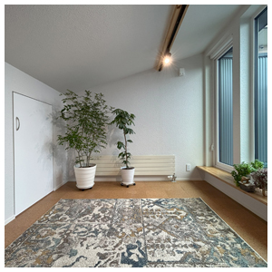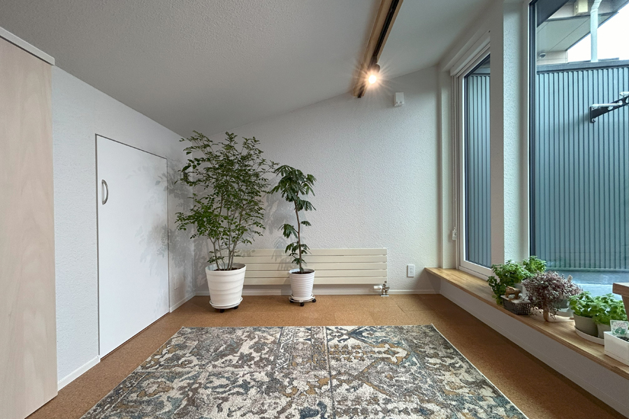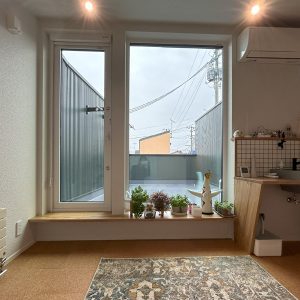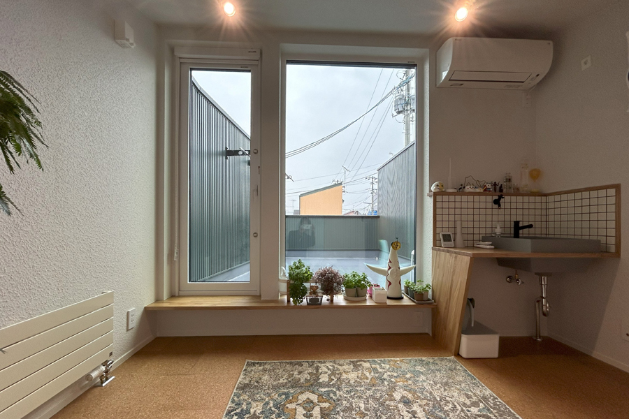 窓の外は大きなルーフテラスで、賑やかな立地なのに周囲の窓が見えません。